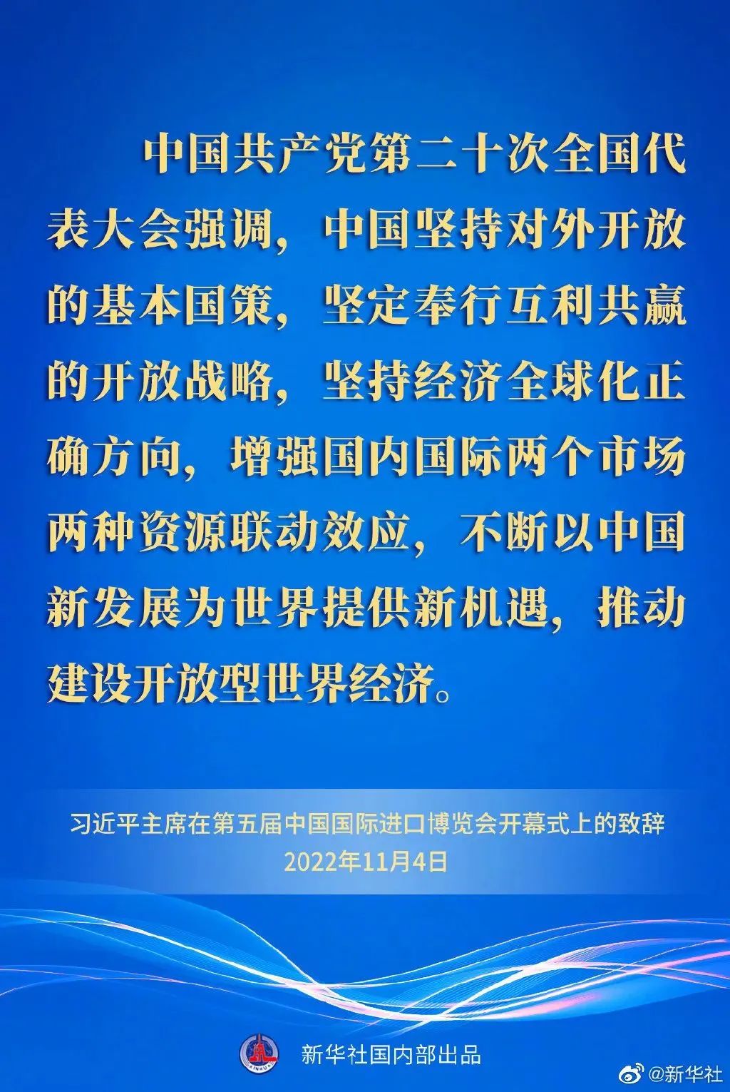 習近平指出,中國共產黨第二十次全國代表大會強調,中國堅持對外開放的基本國策,堅定奉行互利共贏的開放戰略,堅持經濟全球化正確方向,增強國內國際兩個市場兩種資源聯動效應,不斷以中國新發展為世界提供新機遇,推動建設開放型世界經濟。
