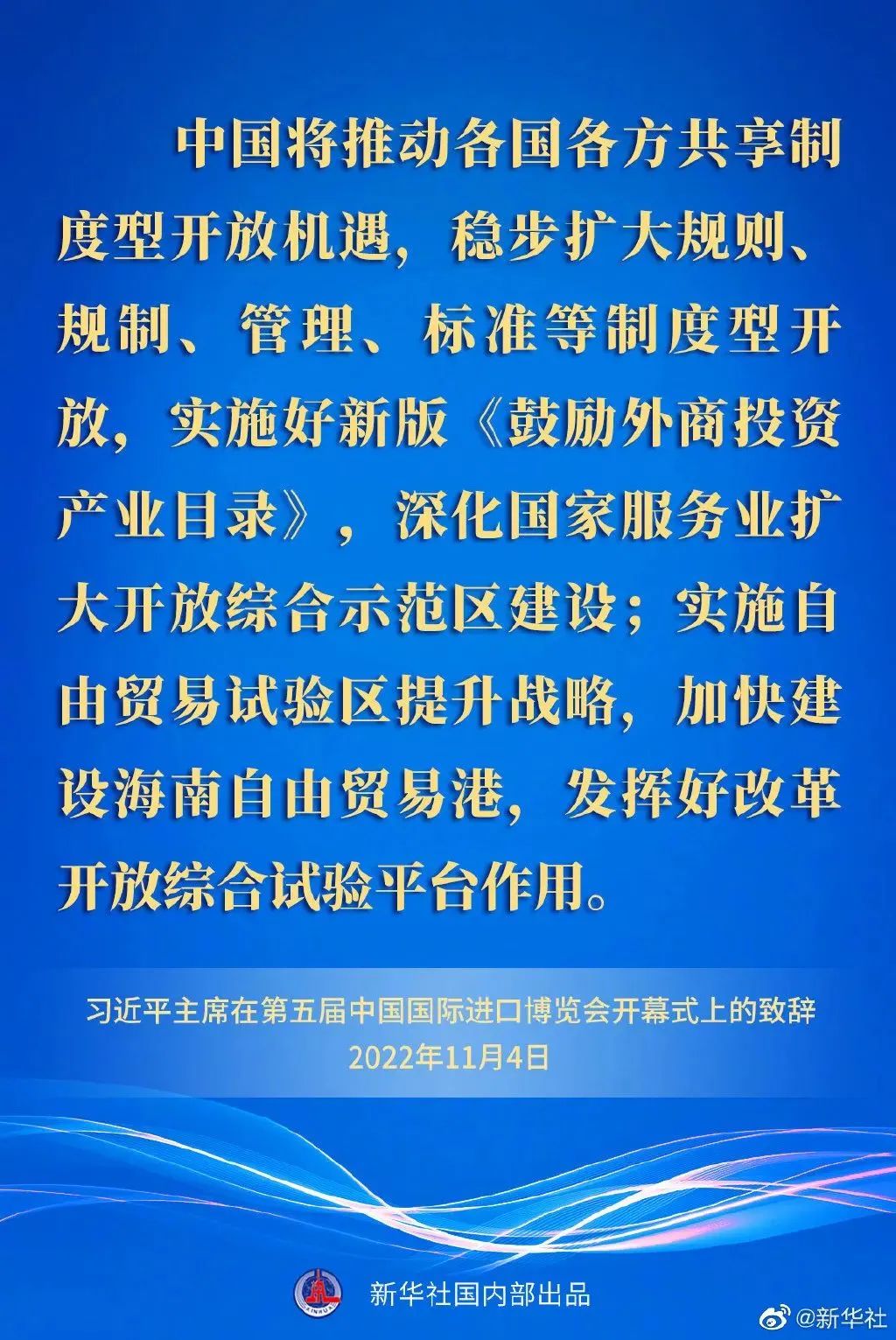 ——中國將推動各國各方共享制度型開放機遇,穩步擴大規則、規制、管理、標準等制度型開放,實施好新版《鼓勵外商投資產業目錄》,深化國家服務業擴大開放綜合示范區建設;實施自由貿易試驗區提升戰略,加快建設海南自由貿易港,發揮好改革開放綜合試驗平臺作用。