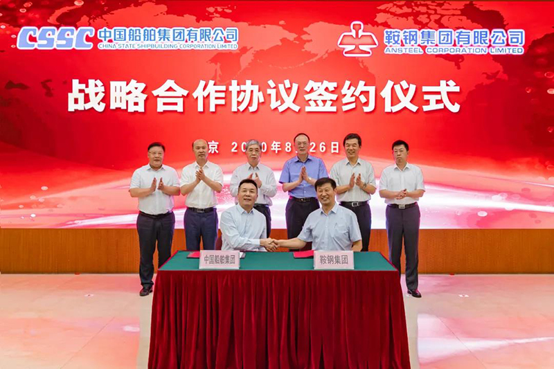 8月26日,中國(guó)船舶集團(tuán)有限公司與鞍鋼集團(tuán)有限公司在京簽署戰(zhàn)略合作協(xié)議。中國(guó)船舶集團(tuán)黨組書(shū)記、董事長(zhǎng)雷凡培,黨組成員、副總經(jīng)理馮永強(qiáng),鞍鋼集團(tuán)黨委書(shū)記、董事長(zhǎng)譚成旭,黨委副書(shū)記、總經(jīng)理戴志浩出席簽約儀式。中國(guó)船舶集團(tuán)黨組成員、副總經(jīng)理孫偉,鞍鋼集團(tuán)黨委常委、副總經(jīng)理王義棟分別代表雙方在協(xié)議上簽字。