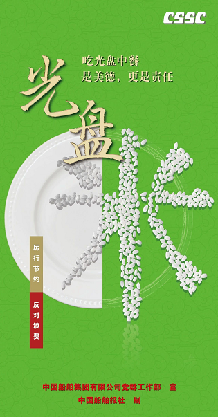 為認(rèn)真貫徹落實習(xí)近平總書記關(guān)于制止餐飲浪費行為的重要指示精神,大力弘揚中華民族勤儉節(jié)約、珍惜糧食的文明用餐習(xí)慣,中國船舶集團積極開展“制止餐飲浪費 踐行光盤行動”專項宣傳引導(dǎo)活動。