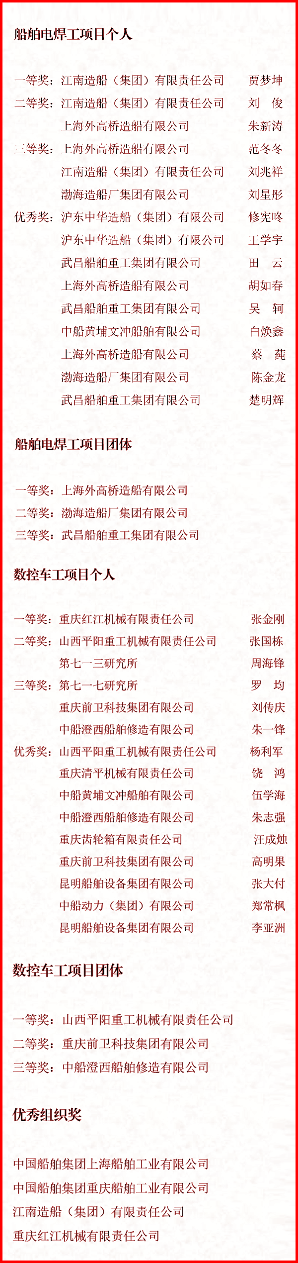 9月27日至9月30日,中國船舶集團(tuán)有限公司聯(lián)合中國就業(yè)培訓(xùn)技術(shù)指導(dǎo)中心,在上海、重慶兩地成功舉辦了國家二類競賽——“2021年全國行業(yè)職業(yè)技能競賽—中國船舶集團(tuán)有限公司職業(yè)技能競賽”。來自49家成員單位共計128名選手同臺角逐,最終評選出個人及團(tuán)體一、二、三等獎和個人優(yōu)秀獎,優(yōu)秀組織獎等獎項。