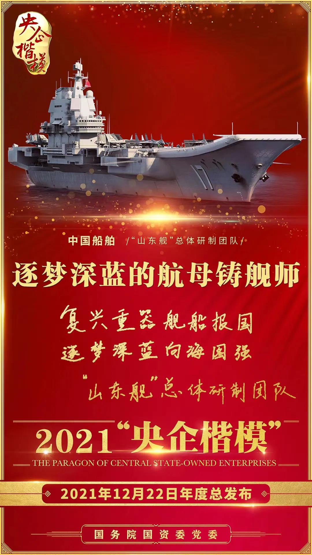 12月22日,國務(wù)院國資委黨委舉行2021年第二批“央企楷模”發(fā)布暨年度總發(fā)布儀式,中國船舶“山東艦”總體研制團(tuán)隊榮獲2021年“央企楷模”榮譽稱號。繼“奮斗者”號萬米載人潛水器研發(fā)團(tuán)隊獲評2020年“央企楷模”榮譽稱號后,中國船舶集團(tuán)再獲此殊榮。