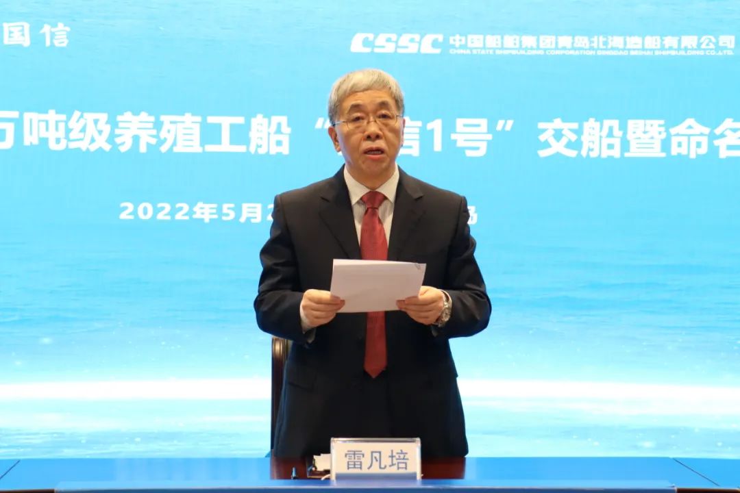 雷凡培在致辭中表示,中國船舶集團作為我國船舶工業(yè)的骨干力量和海洋裝備發(fā)展的引領(lǐng)力量,一直將推動我國高端海洋漁業(yè)裝備建設(shè)和助力我國深遠海養(yǎng)殖產(chǎn)業(yè)發(fā)展作為重要使命和責任。2019年,中國船舶集團向中央提出開展深遠海養(yǎng)殖示范工程等建議,得到了中央領(lǐng)導批示和國家有關(guān)部委的大力支持。本次交付的養(yǎng)殖工船項目,是中國船舶集團落實國家深遠海養(yǎng)殖示范工程的重要舉措,也是貫徹落實國家海洋強國戰(zhàn)略、服務生態(tài)文明建設(shè)和維護國家糧食安全的具體實踐。“國信1號”是全球首艘10萬噸級養(yǎng)殖工船,集深海養(yǎng)殖先進經(jīng)驗、現(xiàn)代化環(huán)保養(yǎng)殖理念和海洋工程裝備尖端技術(shù)于一身,跨領(lǐng)域集成創(chuàng)新,實現(xiàn)了全球深遠海漁業(yè)大型智能養(yǎng)殖裝備的重大突破,創(chuàng)造了養(yǎng)殖漁船單船噸位最大、單船養(yǎng)殖規(guī)模最大、單艙水體量最高等多項國內(nèi)外紀錄,開創(chuàng)了智慧養(yǎng)殖新模式,其前瞻性、引領(lǐng)性、創(chuàng)新性向世界提供了深遠海養(yǎng)殖的“中國方案”。