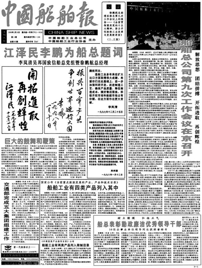 1998年1月16日,《中國船舶報》報道江澤民、李鵬為中國船舶工業總公司題詞。