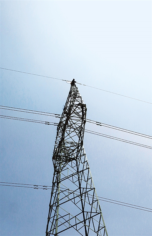 一名電工爬上一座電網(wǎng)塔基進(jìn)行檢修。這條331公里的輸電線路是新疆東南部且末縣和若羌縣10萬多居民用電的主要憑借。