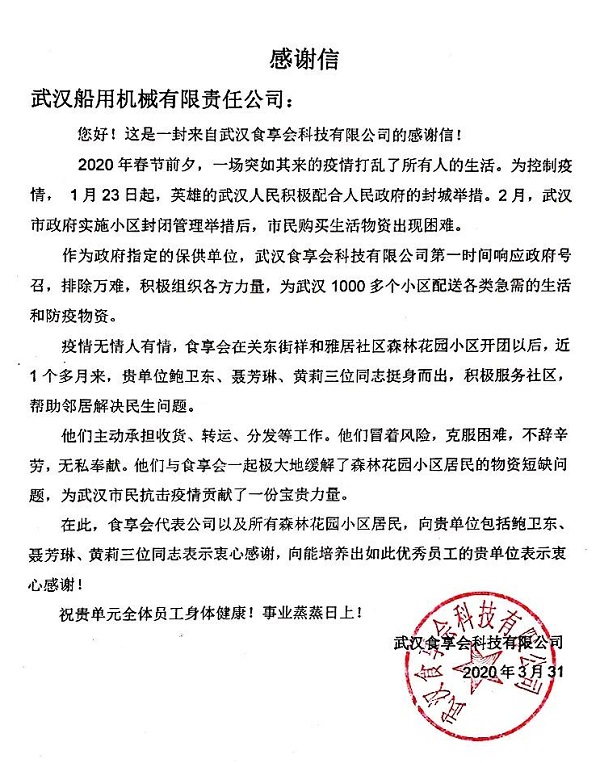 ????中國船舶集團旗下武漢船機,收到武漢食享會科技公司發來的感謝信,信中對武漢船機員工挺身而出,主動擔任武漢社區志愿者不畏艱險、無私奉獻,為抗擊疫情貢獻力量表示敬佩和感謝。