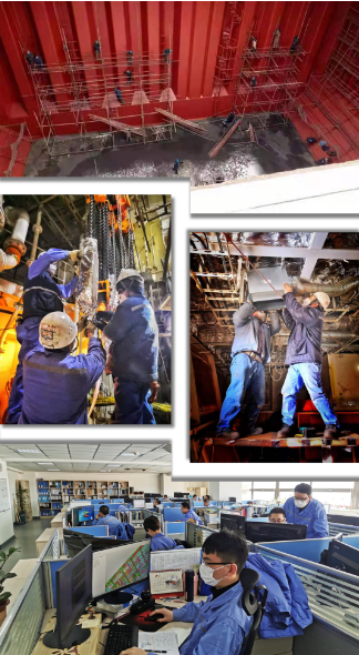 大船集團渤船重工生產現場,機器轟鳴。32萬噸礦砂船9號船重點圍繞上建內裝安裝和全船系統調試開展工作;作為年度重點建造產品的32.5萬噸礦砂船4號船,船臺合攏、軸舵系拉線前準備工作有條不紊展開……