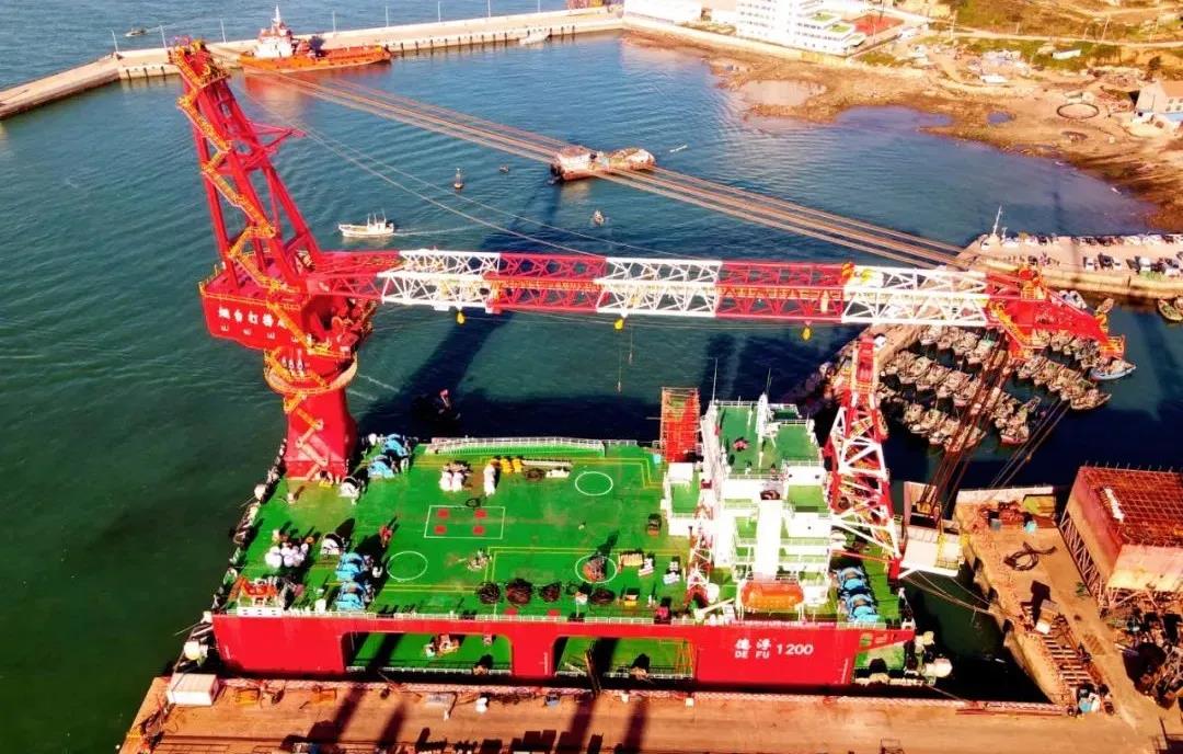 海西重機為“德浮1200”提供最主要的起重設備,起重能力達1200噸,相當可同時吊起800輛小汽車的總重量,全回轉起重能力達1000噸。起重設備將服務“德浮1200”用于近海及淺水水域的風機安裝施工及打撈起重作業以及無限航區拖航。