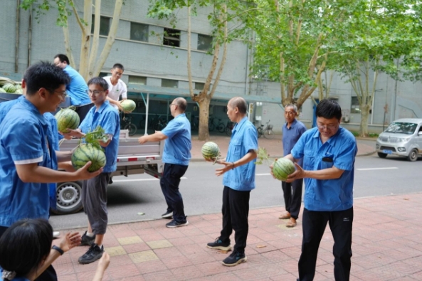 防暑降溫的藥品,冰涼解渴的飲品,又大又甜的西瓜,干凈涼爽的午休場所……中船集團旗下中南裝備、中船陜柴、中船綠洲、中船河柴多措并舉為一線員工撐起關愛“遮陽傘”。