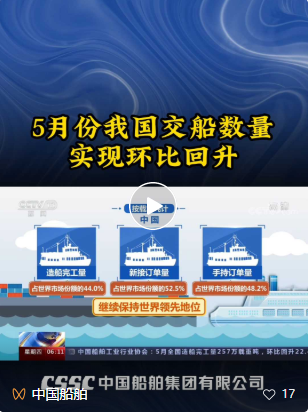 央視新聞 |我國交船數量5月環比回升 造船基地回歸繁忙