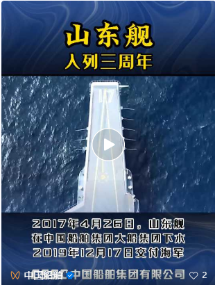 山東艦是我國第二艘航空母艦,也是我國自主設計、自主配套、自主建造的首艘航母。2017年4月26日,山東艦在素有“海軍艦艇搖籃”美譽的中國船舶集團旗下大船集團碼頭下水,自此揭開了中國雙航母時代篇章。