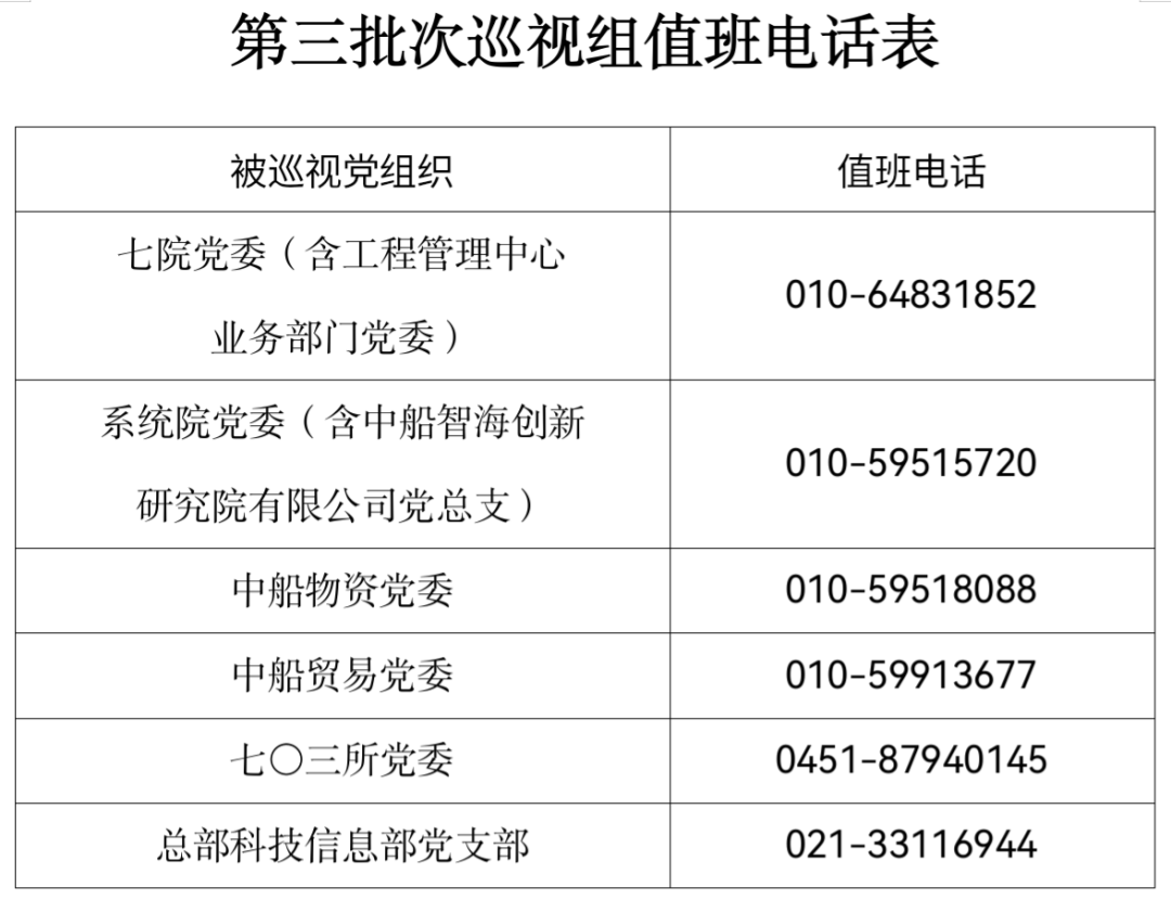 巡視期間,集團(tuán)公司黨組巡視組設(shè)置值班電話(huà)和聯(lián)系信箱,主要受理反映被巡視黨組織領(lǐng)導(dǎo)班子及其成員、下一級(jí)黨組織領(lǐng)導(dǎo)班子主要負(fù)責(zé)人和重點(diǎn)崗位領(lǐng)導(dǎo)干部問(wèn)題的來(lái)信、來(lái)電、來(lái)訪(fǎng),重點(diǎn)關(guān)注違反政治紀(jì)律、組織紀(jì)律、廉潔紀(jì)律、群眾紀(jì)律、工作紀(jì)律、生活紀(jì)律以及巡視整改等方面問(wèn)題反映。第三批次巡視受理信訪(fǎng)截止時(shí)間為9月22日。
